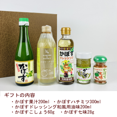 そのかぼすを使った「かぼす本家」でおなじみの定番商品5点【かぼす果汁】【かぼすハチミツ】【かぼすドレッシング和風醤油味】【かぼす七味】【かぼすこしょう】がセットになったギフトセットです。